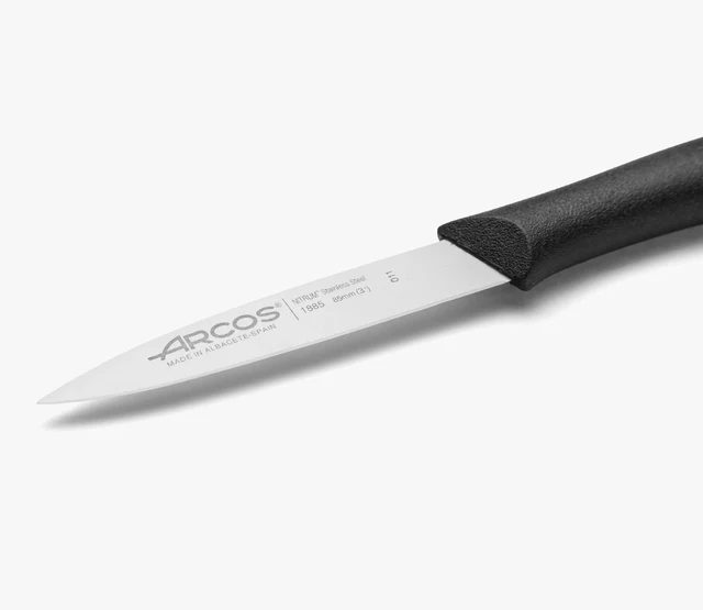 La punta central del cuchillo mondador Serie Nova Negro 85 mm de Arcos facilita el corte y el pelado de frutas, verduras y hortalizas.